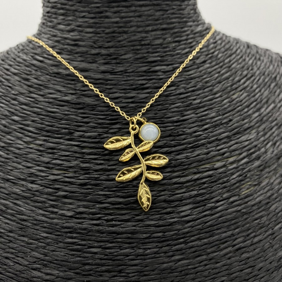 Χρυσό κολιέ φύλλο από ανοξείδωτο ατσάλι με γκρι ημιπολύτιμη πέτρα